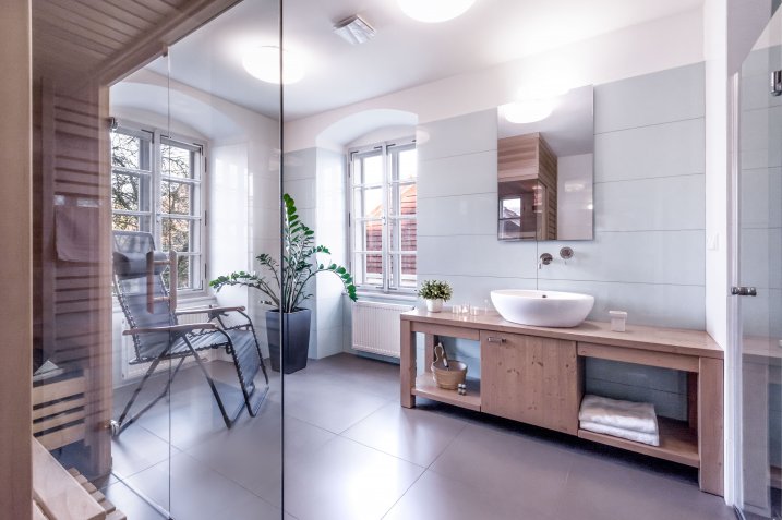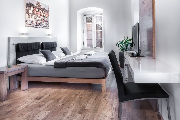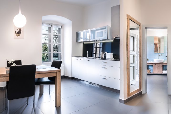 Umístění a výhled1. patro s výhledem na Plešivecké náměstí, zahradu, na zámek a kostel Počet lůžek2 + 1 možná přistýlkaVybavenísauna, sprcha, kuchyně, kompletně vybavená s jídelním stolem (káva, čaj, cukr, smetana)LCD TV, satelit, internet, minibar, trezor, ložnice, WC, fén, deštník, výzdoba reprodukcemi od Egona Schieleho, šatní skříň